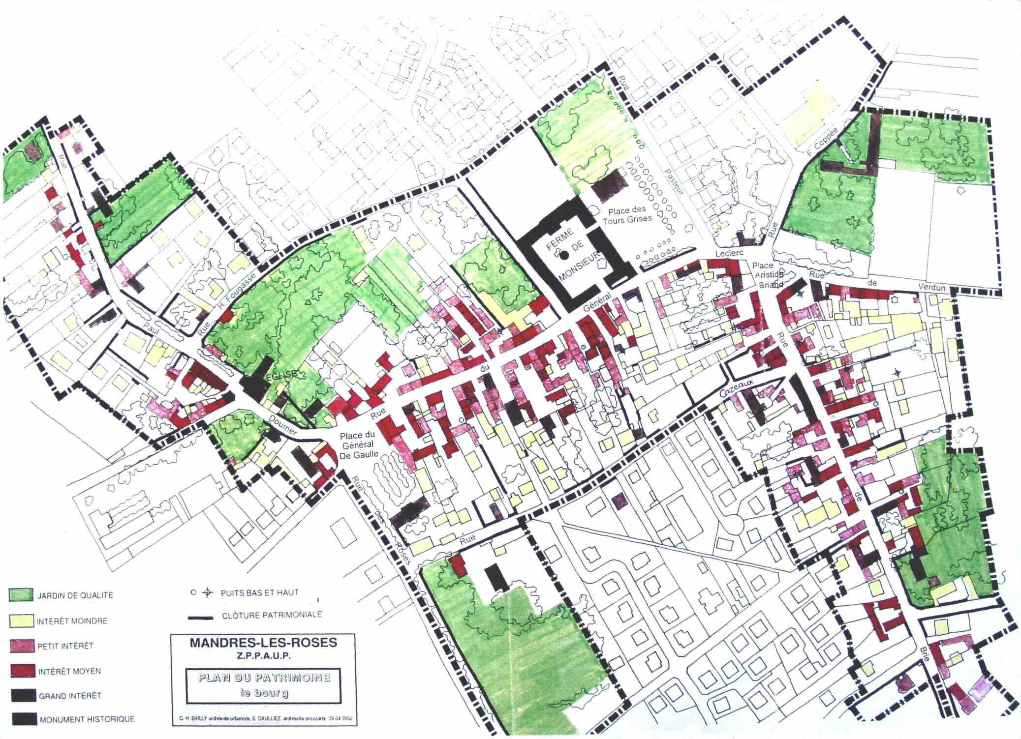 G.H. Bailly, Architecte Urbaniste & S. Caulliez, Architecte-Assistante Recensement sous forme de plan des éléments du patrimoine de Mandres, le Bourg-Centre. 22 avril 2005 - Arrêté Préfectoral Le projet de Zone de protection du patrimoine architectural, urbain et paysager (Z.P.P.A.U.P.) demandé par Monsieur le Préfet de la Région d’Ilede-France de créer ladite Zone sur le territoire de Mandres les Roses. Le règlement de la Z.P.P.A.U.P. se substitue au périmètre des 500 mètres de protection autour de la Ferme de Monsieur. Règlement d'Urbanisme | |||
